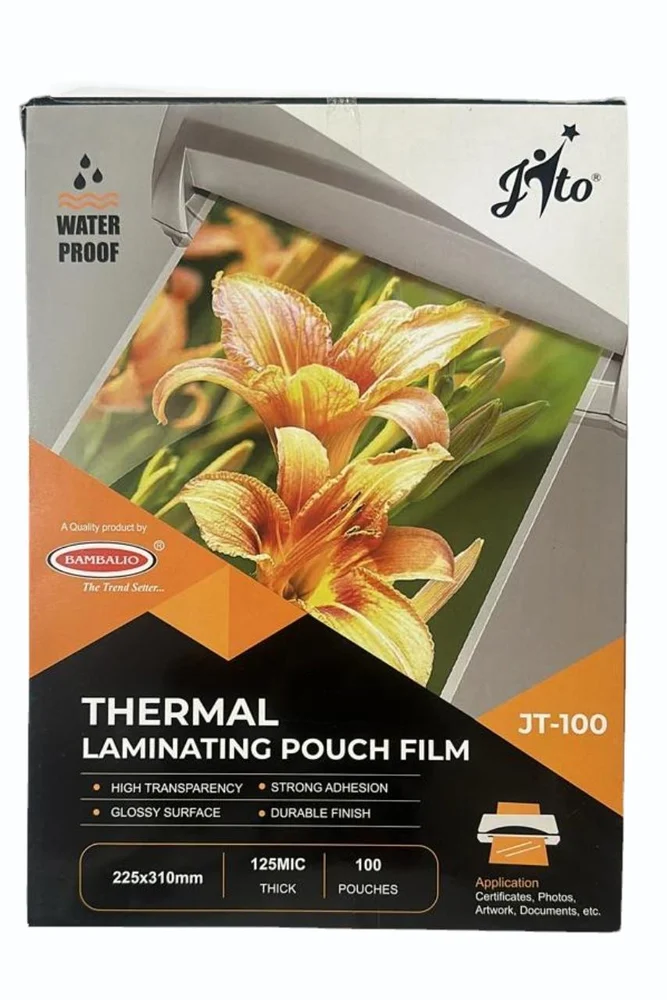A pack of high-clarity thermal laminating pouches sized 225 × 310 mm (A4) with a 125 micron thickness, designed to protect and enhance documents. These pouches are water-resistant and ultra-clear, offering excellent durability and photo-safe protection. They are compatible with all hot roll laminating machines — simply insert the paper or card inside the pouch and feed it into the laminator. Ideal for preserving important documents, certificates, ID cards, photos, menus, passes, and artwork without bubbling, curling, or sticking issues.
